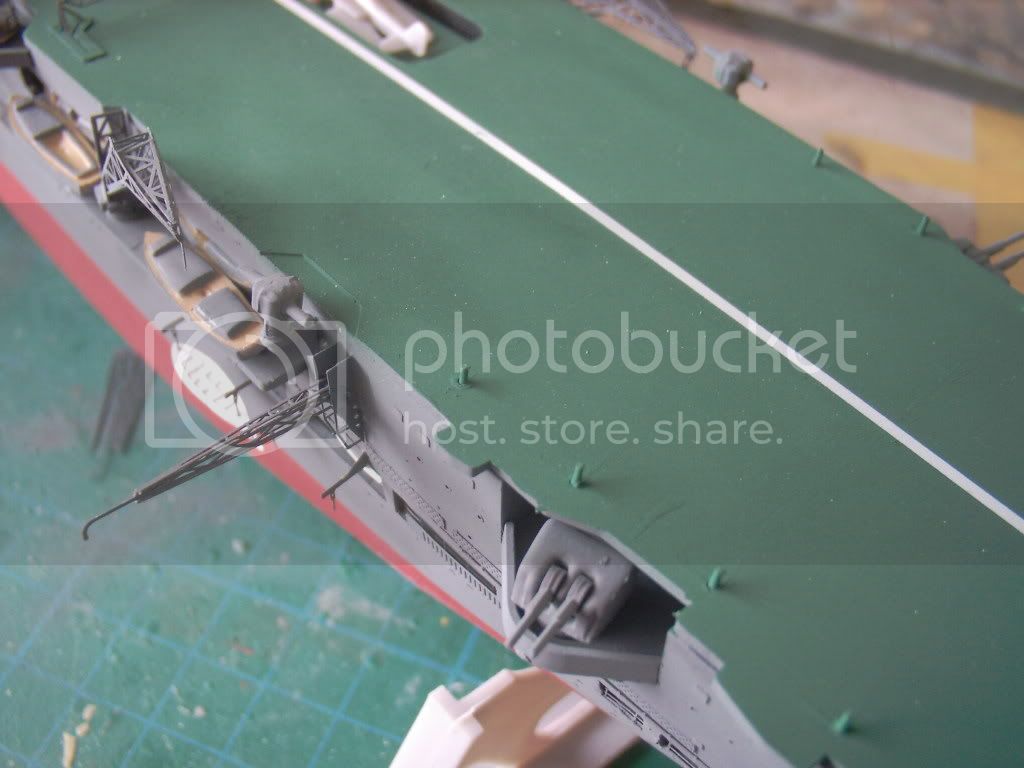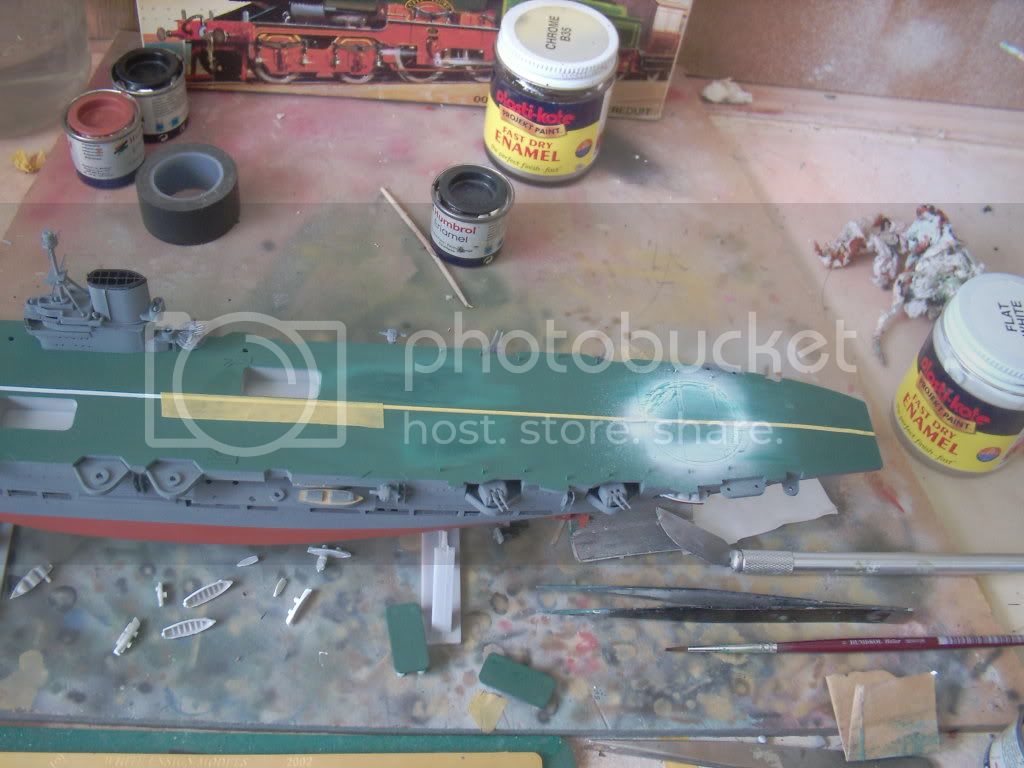 hi graham! the way i did the deck markings was to blast a broad white stripe end to end, then using a metal ruler i cut a strip of tamiya tape to the width i wanted, then i measured across the deck at three points (stern, middle and bow) then divided each of those measurements in half to make sure it ran stright down the middle. with the line of tape in place i then sprayed the deck green (at this point i wasn't going to put the circle marking on) i then had a change of mind, and sprayed a broad circle onto the deck, like so