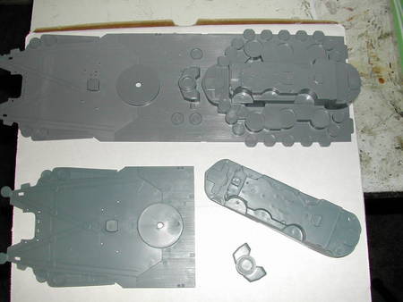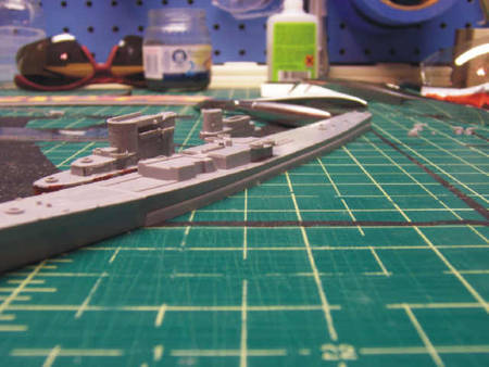 OK OK >>>>>I've managed to get the complete deck on the hull.  It took several days of careful shaving and fitting to get that replacement piece on.  I've cut out some areas to be replaced by PE and filling in the holes that were for the 2 dozen 20 mm single mount guns.  I figure by the end of the weekend I'll be starting work on the turrets.  Going to have to remove AA mounts off 2 of them, and then start adding all the PE for the special Lionroar main gun detail set.