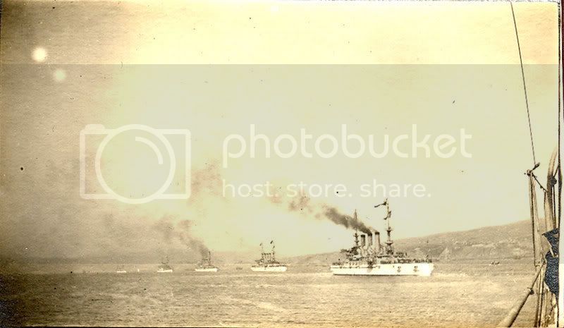 At 11:30 in the morning on 14 February the first signs of the Great White Fleet's approach to Valparaiso could be seen on the horizon from their thick dark plumes of smoke. The Fleet elegantly steamed in a single column with each ship flying Chile's flag. The above photograph, as well as the rest of the photos here are from the collection of William Gerald Child, Midshipman, on the USS Georgia.