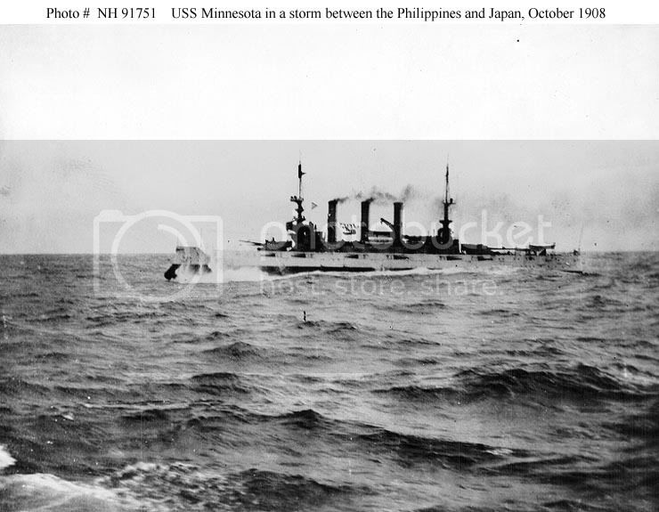 An exciting photo of the USS Minnesota as she pitches her forefoot out of the water during a storm, while steaming from the Philippines to Yokohama, Japan, in October 1908. (It reminds me of the discussion concerning bow out in regard to Skipper Rui’s latest Russian project).