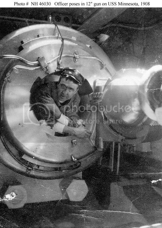 A neat picture of being “in the gun” An officer poses in the breech of one of the after turret's 12"/45 guns, 1908.