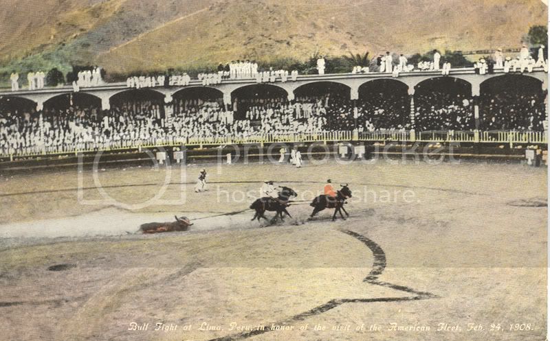As I have already written you a long letter will now write another one not so long but it may be of interest to you. This has been a very hot day and it is now only 3:30 p.m. and I quit work so I could do some writing. We had a number of visitors aboard today and some very swell women were aboard. To get back to what I was going to say Monday was the big day in Lima. The President gave a bullfight in honor of the American Fleet. The bull fight was held at Lima which is situated about ten miles from Callao. There was over 4,000 bluejackets that was allowed to go free at first then they changed it to anyone in uniform was free. We left the ship Monday morning at 10:30 and was on the beach at 10:50 a.m. The officer in charge marched us to street cars which were waiting for us. The street cars had big posters of American flags on which was printed in big letters “Welcome to the American Fleet”.