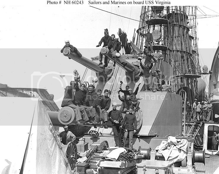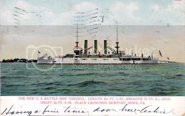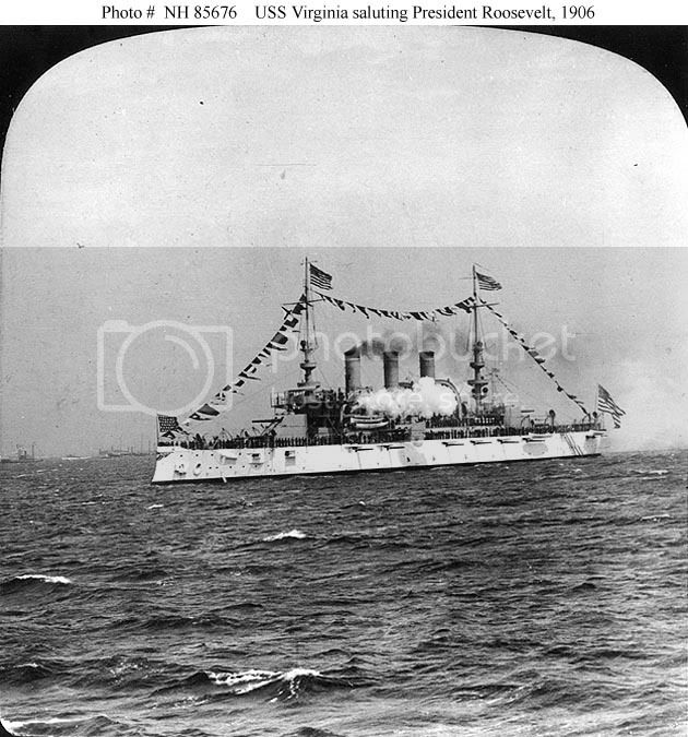 Virginia fired target practices in Cuban waters before she sailed for Hampton Roads on the 10th of April to participate in the Jamestown Tricentennial Exposition festivities. She remained in Hampton Roads for a month, from the 15th April to the 15th of May, before she underwent repairs at the Norfolk Navy Yard into early June. Subsequently reviewed in Hampton Roads by President Theodore Roosevelt between the 7th of June and the13th of June, the USS Virginia shifted northward for target practices on the target grounds of Cape Cod Bay - evolutions that lasted from mid-June to mid-July. She later cruised with her division to Newport; the North River, New York City and to Provincetown, Massachusetts, before conducting day and night battle practice in Cape Cod Bay.