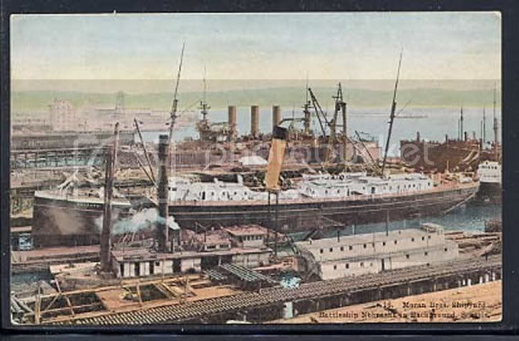 Color drawing of the Nebraska (BB-14) in the background fronted by a unknown steamship at Moran Brothers, Shipbuilding, Seattle WA., probably drawn sometime after her launching on October 7 1904