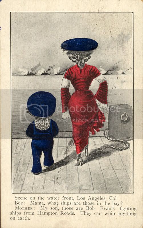 "Five miles long, beginning with the resplendent flagship Connecticut, off Dead Man's Island, in the San Pedro breakwater, and extending to the scintillating battleship Kentucky, anchored almost opposite the Long Beach pier, but a mile distant, the great armada loomed up against the ebon horizon like a fleet of fire; and then suddenly, their powerful searchlights burst forth with penetrating splendor, searching the heavens till the sky was as a crazy quilt of light and shadow patches - and ever shifting constellation of radiance stretching from the farmost mountains of the mainland to the cerulean peaks of Catalina Island." (from With the American Fleet)