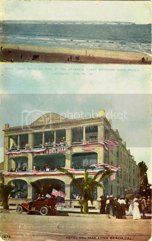 The Hotel Long Beach decorated for the Fleet's arrival. Above it the Fleet on the horizon.