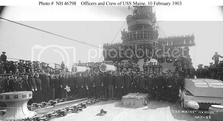 Picture on deck taken on 10 February 1903. Maines Commanding Officer Captain Eugene H.C Leutze is standing just to the left of the 12"/40 gun in the center of the photograph.