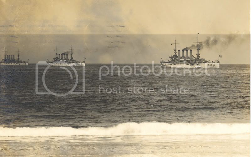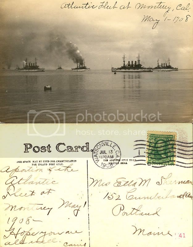 The picture card below shows the USS Tennessee, Washington, and California in March 1908, "expect the fleet May 1st".