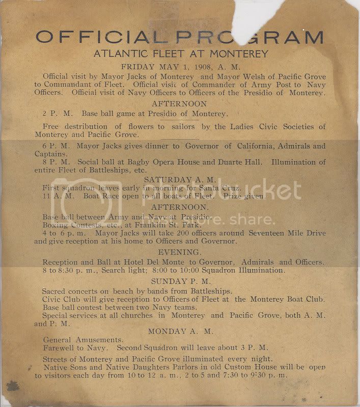As First Squadron left of Santa Cruz, Mayor Jack took two-hundred officers on the seventeen mile drive towards Carmel. In the evening the Hotel Del Monte (now the Naval Postgraduate School) was host to a grand ball. Later that evening the Fleet provided illuminations with their search lights.