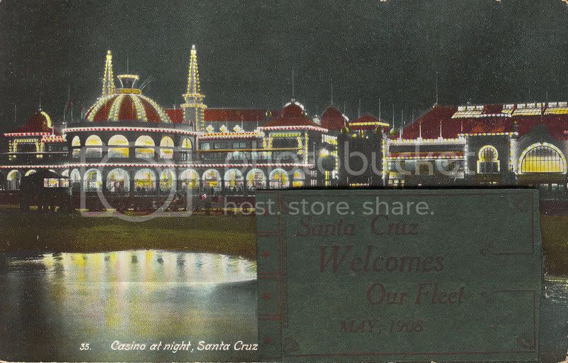 This card shows the Casino at Santa Cruz with a 'Welcome the Fleet' foldout of the ships of the battle fleet.