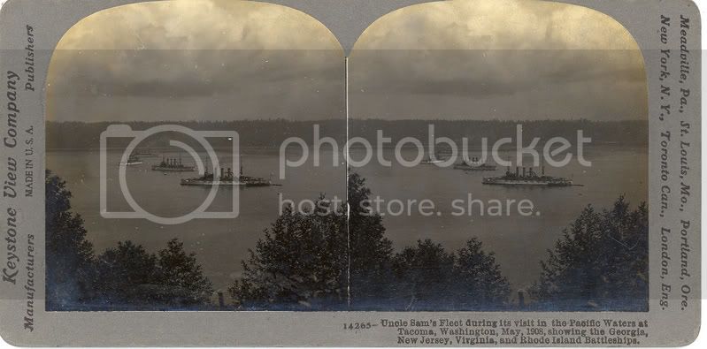 A picture Uncle Sam's Fleet during its visit in the Pacific Waters at Tacoma, Washington, May, 1908, showing the Georgia, New Jersey, Virginia, and Rhode Island Battleships