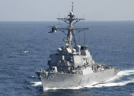 Arabian Sea (Nov. 27, 2006) - An MH-60s helicopter prepares to land on the flight deck of guided-missile destroyer USS Benfold (DDG 65) while pulling alongside Military Sealift Command (MSC) fast combat support ship USNS Supply (T-AOE 6) during Underway Replenishment (UNREP) with amphibious assault ship USS Saipan (LHA 2). Saipan is currently on deployment in the 5th Fleet area of responsibility conducting maritime security operations (MSO) in the Gulf of Aden, Gulf of Oman, Arabian Sea, Red Sea, and Indian Ocean. U.S. Navy photo by Mass Communication Specialist Seaman Patrick W. Mullen III.