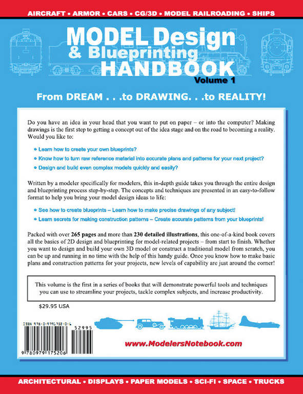 Packed with more than 260 pages and more than 230 detailed illustrations, the MODEL DESIGN & BLUEPRINTING HANDBOOK, Volume 1, is geared toward enthusiasts of all modeling genres. Both 3D and traditional modelers alike will find it a valuable resource for planning and designing their projects. In fact, this all-in-one guide provides a foundational course in model design from start to finish, covering all the basics of analyzing available reference, sketching 3-view drawings, drafting blueprints, and making accurate construction patterns/templates for model-related projects. It will help modelers learn how to: