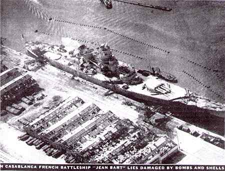 On November 8, 1942, the French fleet in Casablanca was attacked by American warships and airplanes from USS Ranger. Jean Bart managed to battle USS Massachusetts, taking hits from several bombs and 16 inch (406 mm) shells. On the 10th, Jean Bart opened fire again onto USS Augusta, much to the surprise of the American staff who thought she had been silenced. This drew action from Ranger, and Jean Bart took two 500 kg bombs, which opened a leak, making her run aground. Combat was over in the evening, and the ship was surrendered to Free France.