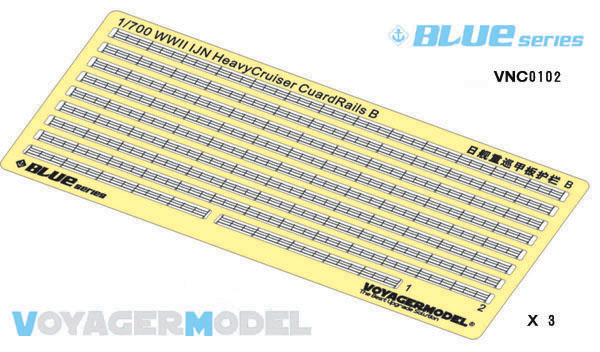 Photoetched railings (guard rails) for IJN heavy cruisers. These feature a more 'straight-across' look such as when cable or chain is pulled taught.