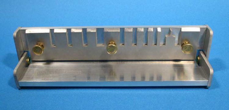 Next, we have the pressure/finger plate, which is also constructed from the same specially treated stainless steel as the side hinge plates. Measuring in at 7” long, X 1 ½” wide, by 1/8” thick, one side features a solid, uniform flat face for long bends, while the reverse side features precision cut “fingers” of various inside depths for forming complex/detailed bends. The Fender Bender is capable of accommodating brass or aluminum stock to a maximum thickness of 0.020 inches (0.5mm) and a minimum thickness of 0.001 inches (0.03mm). Using materials outside of these tolerances may result in damage to the machine itself as well as the materials the user is attempting to bend and is not recommended. The Fender Bender is capable of forming uniform bends from 0 to 120 degrees. As a rule of thumb, minimum flange width is equal to 3 times the material thickness. Absolute minimum width is .020”.