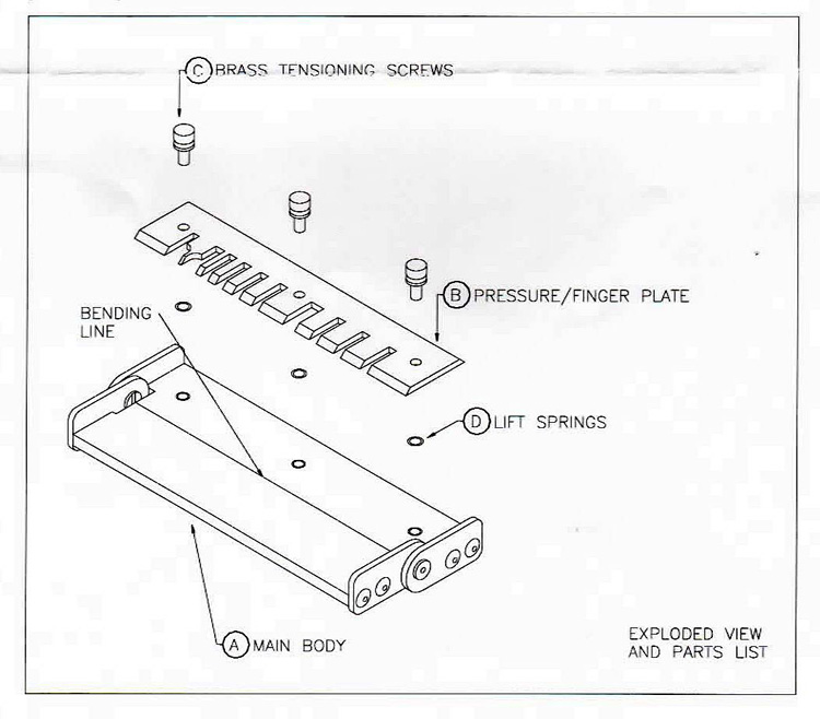 The tool worked smoothly, with consistent results each time. The lower jaw lifts easily with one hand, except with heavier stock, then a two handed bend is necessary. Also note, that the Fender Bender can continue its bend radius beyond the standard 90 degree, going through to a full 120 degree bend, which is a definite plus. The brass tensioning screws worked easily, held their position without loosening, and loosened easily with your fingers. Be very careful when you are working with these screws, behind each one is a tiny ring of spring steel, which are the lifting springs, and are easy to lose. Do yourself a favor and work over a bench-top when you are changing position of the Pressure/Finger Plate. Although these little springs are replaceable, losing one (or more) will reduce the ease in lifting the finger plate with just one thumb.
