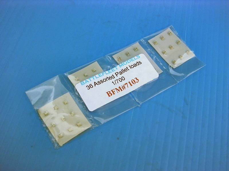 This accessory set from BFM consists of four resin wafer sheets of 1/700 scale, individual pallet loads, 9 seperate pallet loads per sheet.  The sheets come packaged sealed in an individually compartmented plastic bag, with Harry's Logo/description sticker on front...